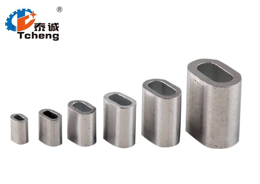 鋼絲繩鋁套—鋁套是鋁材質(zhì)的,較輕,用來(lái)固定鋼絲繩兩端的頭的,鋼絲繩根據(jù)需要的掛圈大小,插入鋁套,然后放入壓套機(jī)模具內(nèi),(根據(jù)鋁套型號(hào)對(duì)應(yīng)壓套機(jī)模具,模具型號(hào)跟鋁套型號(hào)都是標(biāo)準(zhǔn)尺寸),壓制完,把兩邊擠壓出來(lái)的鋁廢料清理掉,一根鋼絲繩完成!